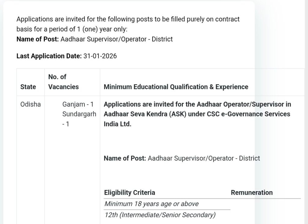 Aadhaar Supervisor/Operator Recruitment 2026 has been announced by CSC e-Governance Services India for eligible candidates from Odisha. A total of approximately 282 posts are available for the positions of Supervisor/Operator. Candidates who have completed 10th, 12th, or ITI are eligible to apply. The minimum age requirement is 18 years, and selected candidates will receive a good salary as per norms. The selection process will be based on an interview, and applications must be submitted online through the official website cscspv.in. Interested and eligible candidates should apply before the last date, 31 January 2026.