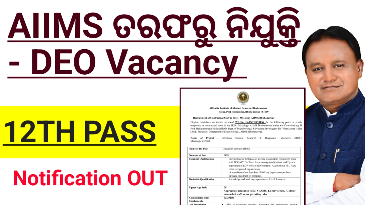 All India Institute of Medical Sciences, Bhubaneswar (AIIMS Bhubaneswar) has released an official notification for the recruitment of Data Entry Operator (DEO) posts. A total of one (01) vacancy is available for eligible candidates belonging to Odisha. Applicants must have passed 12th standard, and the maximum age limit is 28 years. The selected candidate will receive a consolidated salary of ₹29,200 per month. The application process is online, and interested candidates must apply on or before 10 February 2026. The selection process will be conducted as per details mentioned in the official notification. For more information and to apply online, candidates are advised to visit the official website: https://aiimsbhubaneswar.nic.in.