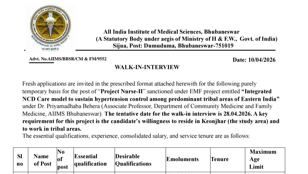 The All India Institute of Medical Sciences Bhubaneswar has announced a walk-in recruitment for the post of Project Nurse-II under a contractual project. Candidates from Odisha who have completed a three-year General Nursing and Midwifery (GNM) course are eligible to apply. The position offers a monthly salary ranging from ₹24,000 to ₹25,200, with a maximum age limit of 28 years. Interested applicants can attend the walk-in interview scheduled on April 28, 2026. For further details, candidates are advised to visit the official website.