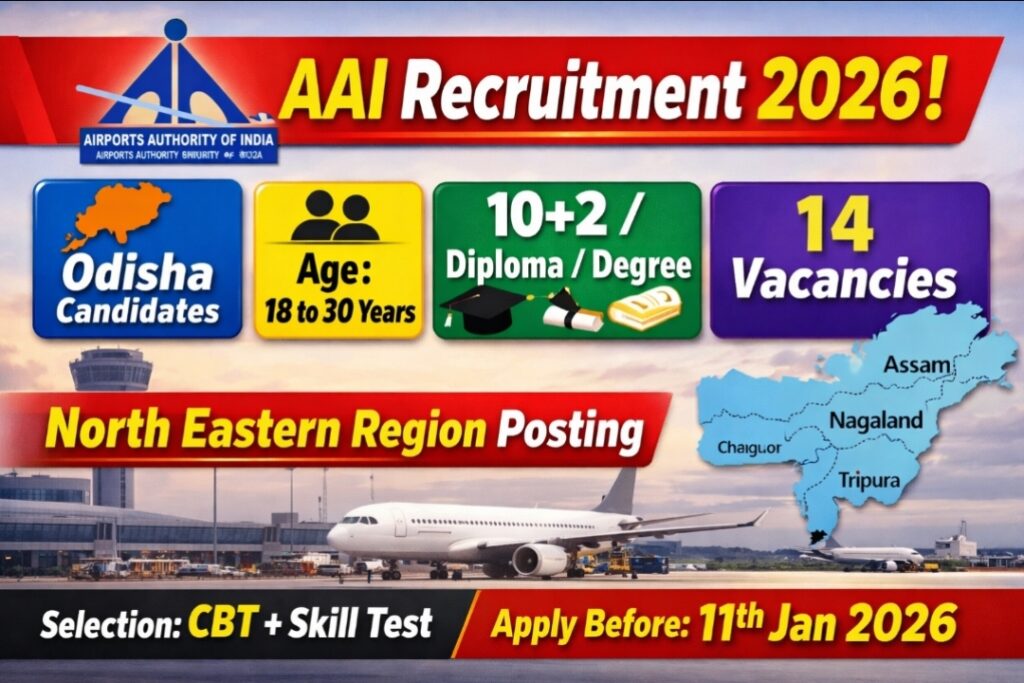 Airports Authority of India (AAI), North Eastern Region has released a recruitment notification for 14 vacancies for candidates from Odisha. Applicants aged between 18 and 30 years as on 06 December 2025 are eligible to apply. Candidates must have passed 10+2, Diploma, or Degree from a recognized institution. The selection process will include a Computer Based Test, Skill Test (if applicable), and Document Verification. Selected candidates will be posted at various airports across the North Eastern Region including Assam, Arunachal Pradesh, Manipur, Meghalaya, Mizoram, Nagaland, and Tripura. The last date to apply online is 11 January 2026.