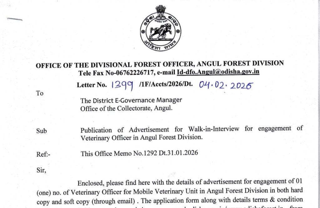 Angul District Forest Division has released an official recruitment notification for the post of Wildlife Veterinary Officer for the year 2026. The recruitment is being conducted by the Divisional Forest Officer (DFO), Angul Forest Division, Odisha. A total of 01 vacancy is available, and candidates from Odisha state are eligible to apply. Applicants must possess BV.Sc & A.H or M.V.Sc qualification, and the age limit should be less than 65 years. The selected candidate will receive a monthly salary of ₹65,000 (inclusive of TA and DA) along with a vehicle for conveyance. The application mode is online, and the last date to apply is 16th February 2026. The selection process includes a written examination followed by an interview. Interested candidates can visit the official websites www.angul.odisha.gov.in and www.odishaforest.in for detailed notification and application instructions.