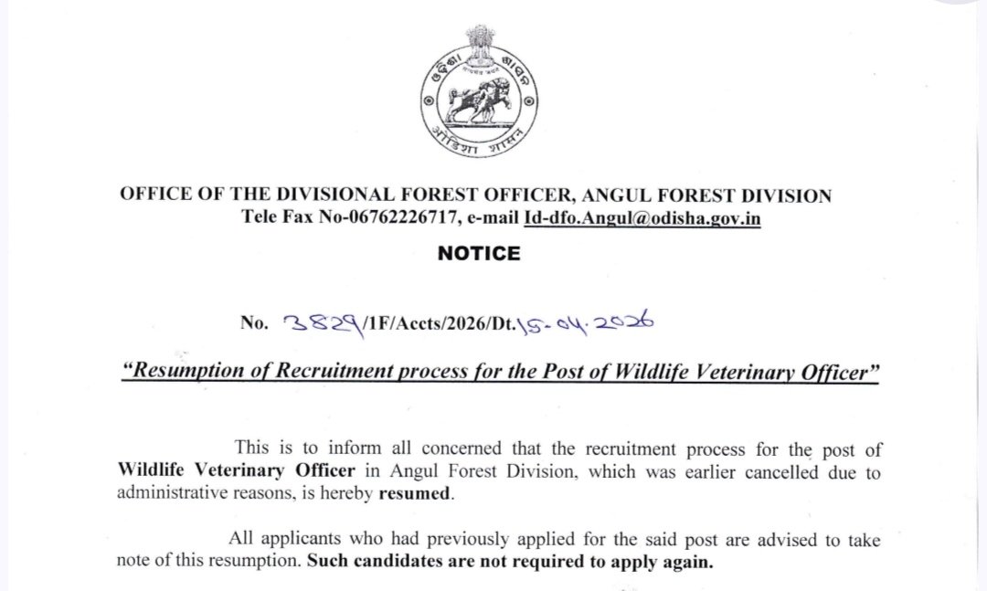 The Angul Forest Division Recruitment 2026 has announced a vacancy for the post of Wildlife Veterinary Officer on a contractual basis. This opportunity is open to candidates from Odisha who possess the required qualifications of BV.Sc & A.H or M.V.Sc. There is one post available, offering a monthly salary of ₹65,000, with no application fee required. Applicants must not exceed the maximum age limit of 64 years. The selection process will be based on a written examination followed by an interview. Interested candidates need to apply through offline mode before the last date of 30 April 2026, and further details can be accessed through the official website.