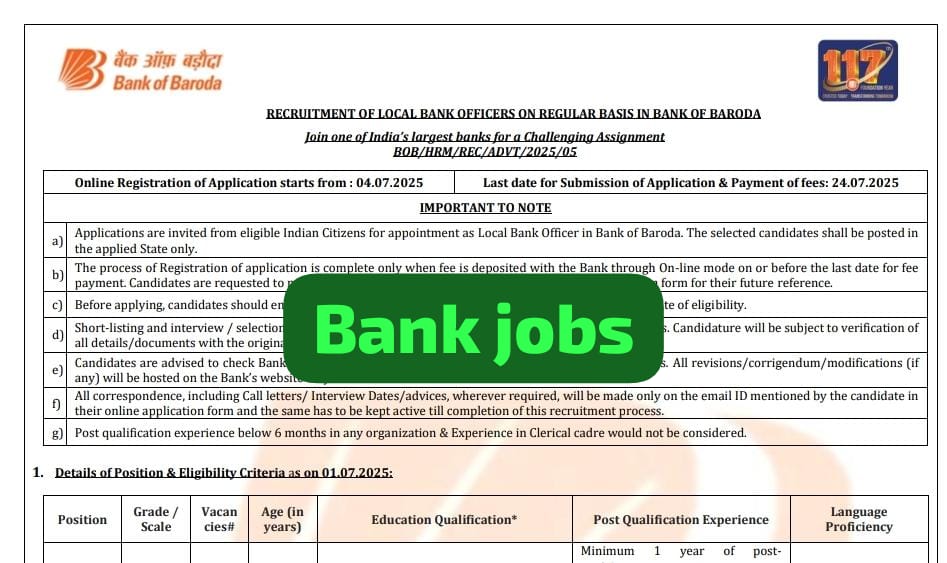 | Bank of Baroda Recruitment 2025 Important Dates: ▪️Application Date for Apply Online: 04-07-2025 ▪️Application Last Date for Apply Online: 24-07-2025 |