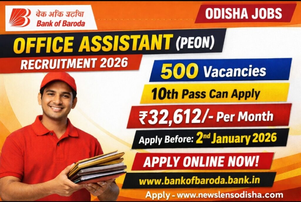 Bank of Baroda has released a recruitment notification for the post of Office Assistant (Peon) for the year 2026. A total of 500 vacancies are available for eligible candidates from Odisha. Interested applicants who have passed the 10th standard can apply through online mode before the closing date. The selected candidates will receive a monthly salary of ₹32,612/-. The selection process will be conducted as per the details mentioned in the official notification. Eligible and interested candidates are advised to visit the official website of Bank of Baroda and complete the application process on or before 02 January 2026.