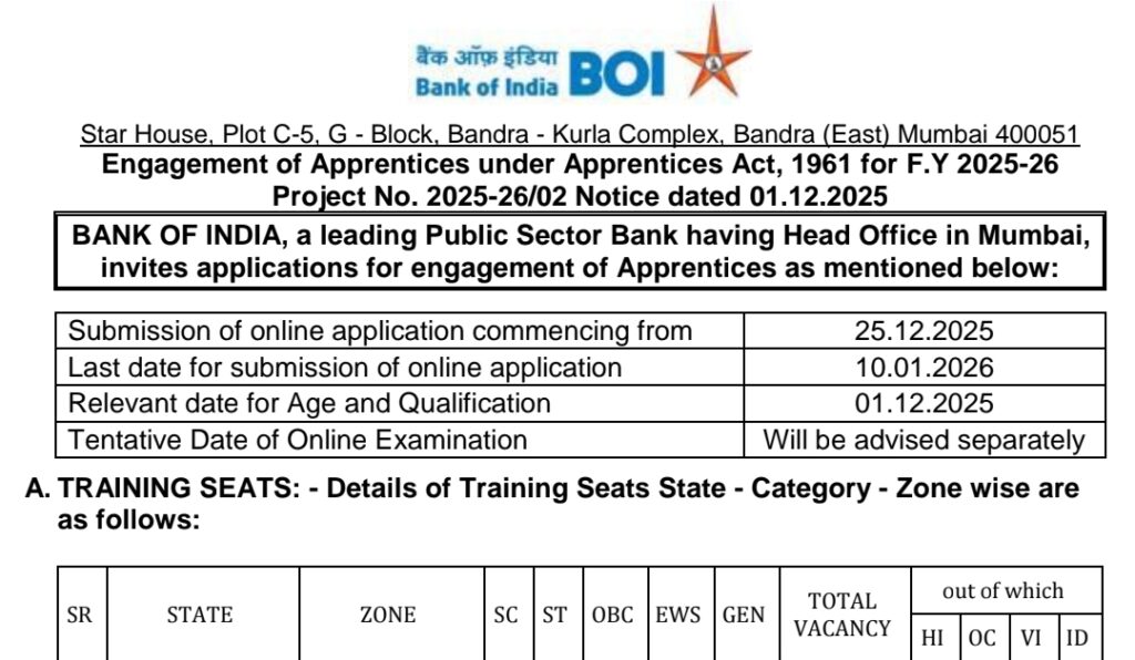 Bank of India (BOI) has released the Apprentice Recruitment 2026 notification for 400 vacancies across India. Candidates holding a Bachelor’s Degree in any stream are eligible to apply for the Bank of India Apprentice post. Selected candidates will receive a monthly stipend of ₹13,000 during the apprenticeship period. The selection process will be as per the official notification. Interested and eligible applicants must submit their application online through the official website https://bankofindia.bank.in on or before 10 January 2026. This is a great opportunity for graduates seeking experience in the banking sector.