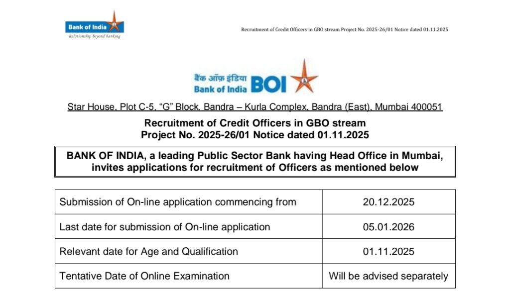 Bank of India has announced Recruitment 2026 for the post of Credit Officer, offering a total of 514 vacancies across India, including opportunities for candidates from Odisha. Applicants must possess a graduation degree in any discipline from a recognized university to be eligible. The age limit for candidates is between 25 and 40 years, as per the notification, with age relaxation applicable according to government rules. Selected candidates will be appointed at locations across India based on organizational requirements. The salary package will be offered as per Bank of India norms and will include applicable allowances. Interested and eligible candidates can apply through online or offline mode via the website. The last date to submit the application form is 05 January 2026.
