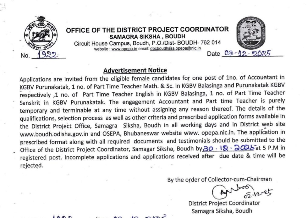 Kasturba Gandhi Balika Vidyalaya (KGBV), Boudh, Odisha has released a recruitment notification for the year 2026 inviting applications for Accountant and Part Time Teacher posts. A total of four vacancies are available for subjects including Mathematics and Science, English, and Sanskrit. Eligible candidates must be between 18 and 35 years of age as per norms. Selected candidates will receive a monthly salary ranging from ₹8,250 to ₹13,750 depending on the post. Interested applicants should carefully check eligibility criteria and submit their applications before the last date, 30 December 2025, through the official website www.boudh.odisha.gov.in for further details and updates as candidates are advised to apply early and keep copies of documents.