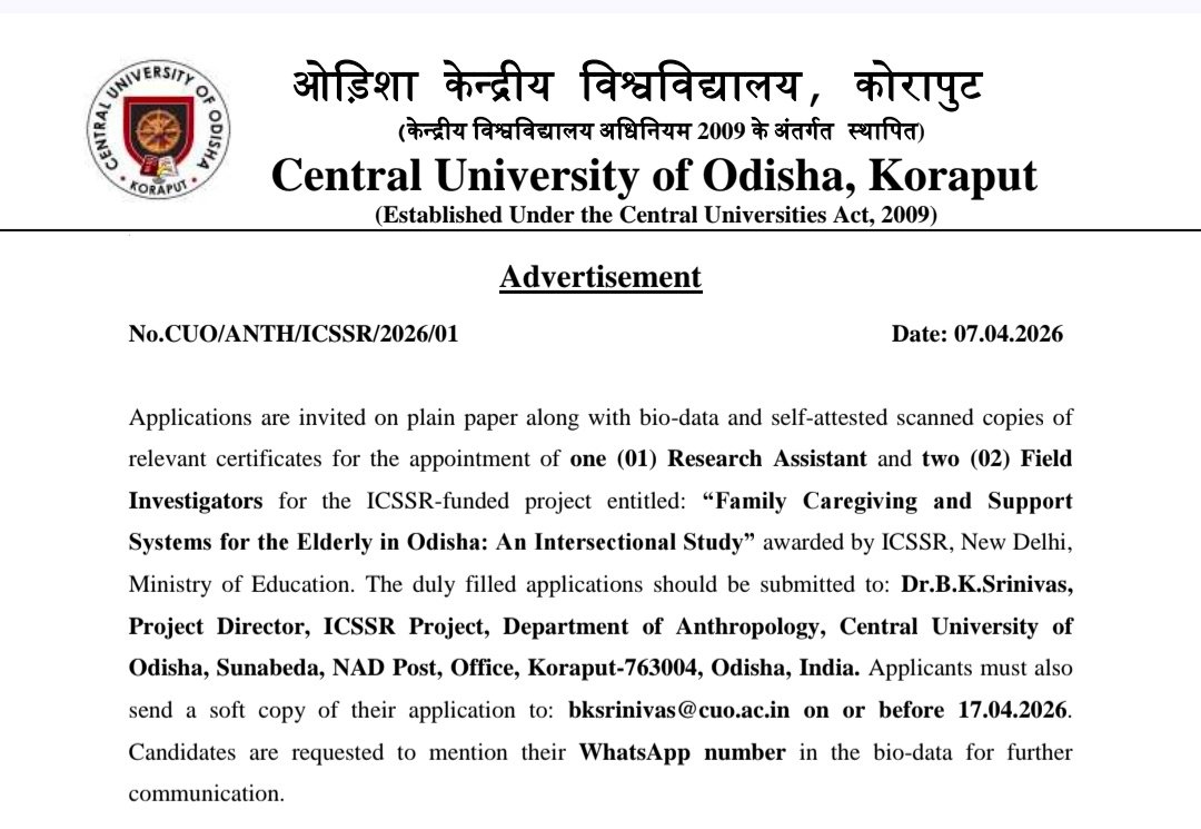 The Central University of Odisha has announced a recruitment notification for 2026 under Advt. No. CUO/ANTH/ICSSR/2026/01, inviting applications for the posts of Research Assistant and Field Investigator. A total of 3 vacancies are available, and candidates from Odisha with a postgraduate degree are eligible to apply. The selected candidates will receive a monthly salary of ₹37,000 for the Research Assistant post and ₹20,000 for the Field Investigator role. This is a project-based opportunity, and interested applicants must submit their applications through email before the last date, 17 April 2026. For more details, candidates can visit the official website of the university.