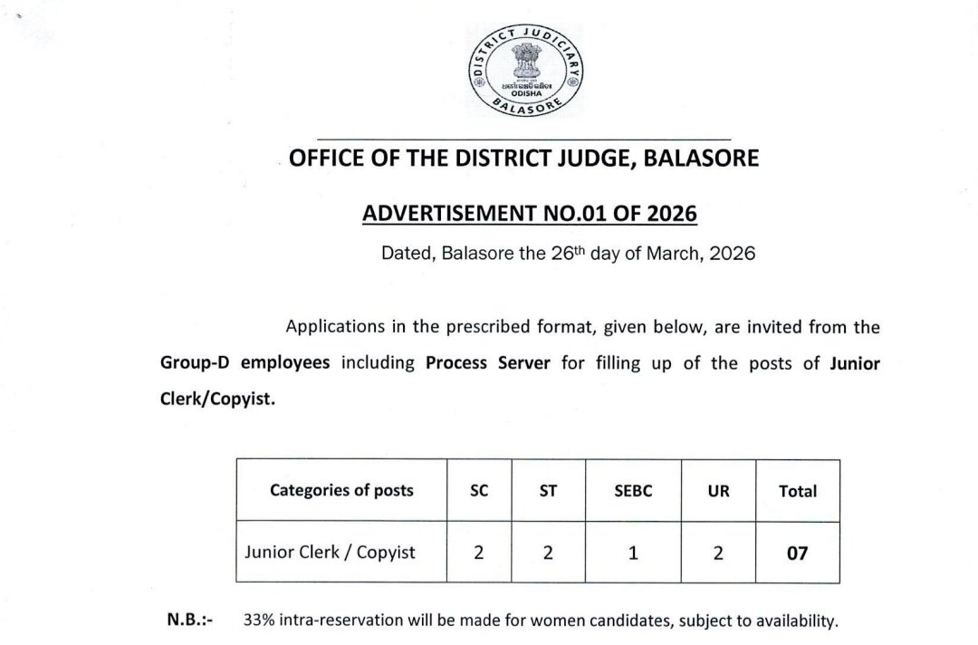 The District Court Balasore has announced a recruitment notification (Advt. No. 01 of 2026) for the post of Junior Clerk/Copyist, offering a total of 07 vacancies. Candidates who have completed a +3 (degree) along with a Diploma are eligible to apply for this position. This opportunity is open to applicants from Odisha, making it a suitable option for local candidates seeking a full-time government job. Interested candidates must submit their applications through offline mode before the last date, 10 April 2026. For detailed information regarding eligibility criteria, application process, and other instructions, applicants should visit the official website https://balasore.dcourts.gov.in/