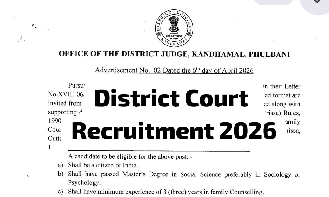 District Court Kandhamal has released a recruitment notification (Advt No. 02 dated 06.04.2026) for the post of Counsellor on a contractual basis. There is one vacancy available, and candidates from Odisha are eligible to apply. Applicants must possess an M.A or M.Sc qualification and should be above 35 years of age. The application process is offline, and interested candidates must submit their forms before the last date, 27 April 2026. For more details and application guidelines, candidates can visit the official website provided.