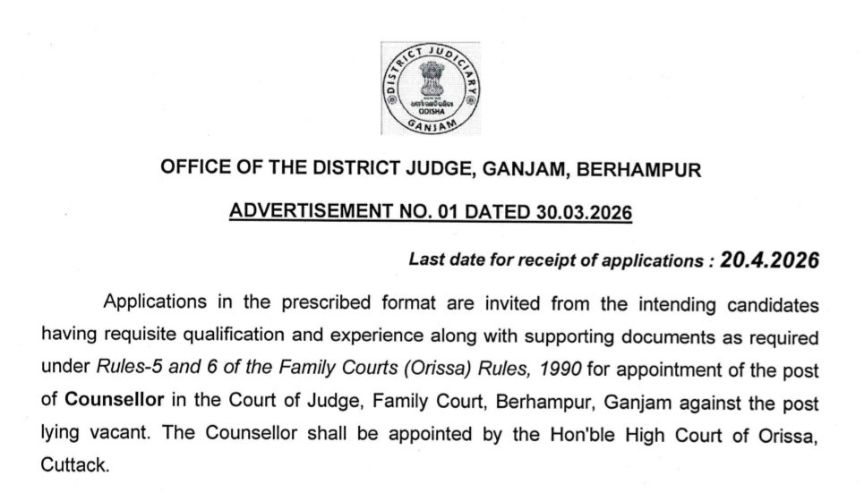 The Office of the District Judge, Ganjam – Berhampur has released a recruitment notification for the post of Counsellor on a contractual basis. A total of 1 vacancy is available, and candidates belonging to Odisha are eligible to apply. Applicants must possess a Master’s Degree to qualify for this position. The selected candidate will receive a monthly salary of ₹6,000 along with an assisting fee of ₹1,000 per day. The maximum age limit for applicants is 35 years. Interested candidates need to submit their applications through offline mode before the last date, 20 April 2026. This is a good opportunity for qualified individuals seeking government-related contractual jobs in Odisha. For more details, candidates can visit the official website.