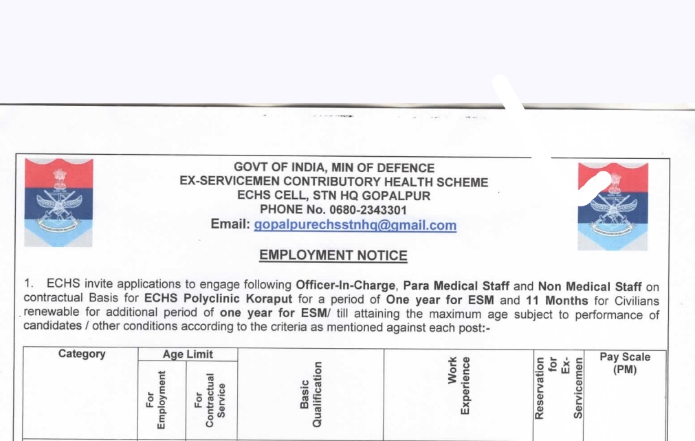 Recruitment Notification: Ex-Servicemen Contributory Health Scheme (ECHS), Ministry of Defence has released a recruitment notification for 9 contractual posts at ECHS Polyclinic Koraput, Odisha. Eligible candidates from Odisha can apply offline. The salary ranges from ₹21,800 to ₹95,000 per month, depending on the post. The age limit is 53 to 65 years and educational qualification required is Graduate/Diploma as per post norms. The engagement will be on a contract basis (1 year for Ex-Servicemen / 11 months for Civilians). Interested candidates must submit their application offline by post or hand on or before 01 March 2026. The interview will be conducted on 17 & 18 March 2026 at Stn HQ Gopalpur, Ganjam, Odisha. For detailed notification and application format, visit the official website echs.gov.in.