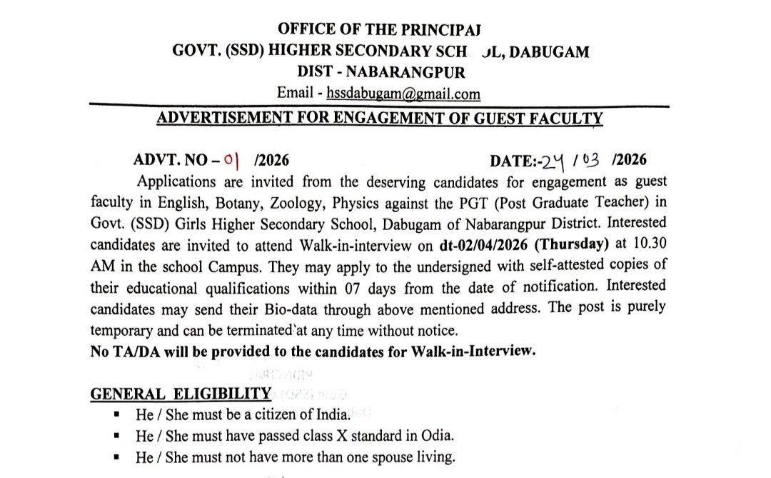Govt SSD Higher Secondary School Dabugam has announced recruitment for Guest Faculty posts in 2026, inviting eligible candidates from Odisha to attend a walk-in interview. Applicants must possess M.Sc, M.A, and B.Ed qualifications. The position offers a salary of Rs. 400 per class of 45 minutes, up to Rs. 16,000 per month. Superannuated faculty up to 70 years of age can apply. This is a temporary job opportunity, and interested candidates must apply before 30 March 2026.