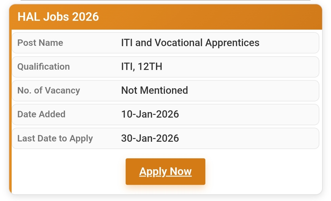 Hindustan Aeronautics Limited (HAL) has released a notification for the recruitment of ITI and Vocational (10+2) Apprentices. Candidates who have passed ITI (NCVT/SCVT) or Intermediate Vocational (10+2) in the years 2023 to 2025 are eligible to apply. The age limit for applicants is 18 to 27 years. Selected candidates will receive a stipend/salary as per the official notification. Interested and eligible candidates must submit their applications on or before 30 January 2026 through the official website www.hal-india.co.in.