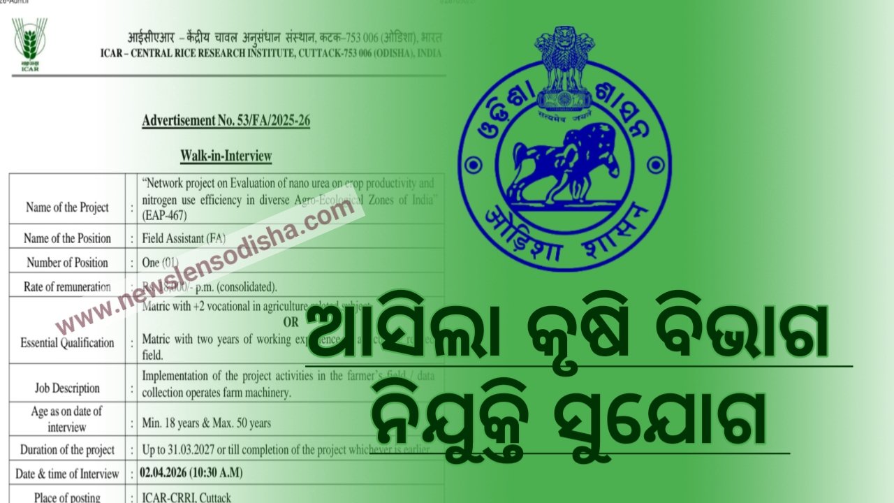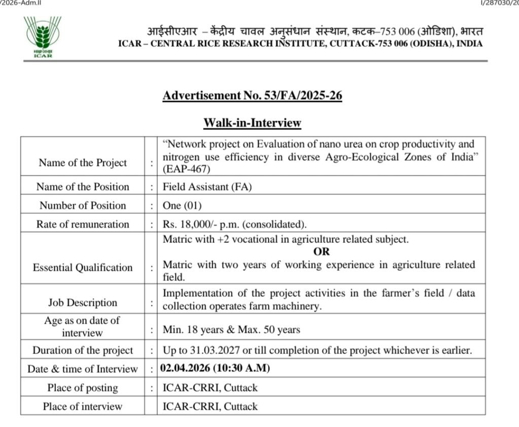 The ICAR Central Rice Research Institute (CRRI) has announced recruitment for the post of Field Assistant in 2026, offering a monthly salary of ₹18,000. Candidates from Odisha who have completed Matric along with +2 vocational education in agriculture-related subjects are eligible to apply. The age limit for applicants ranges from 18 to 50 years. The selection process will be conducted through a walk-in interview scheduled for 2nd April 2026. Interested candidates can attend the interview directly as the application mode is offline. For more details, applicants can visit the official website https://icar-crri.in/ and stay updated.