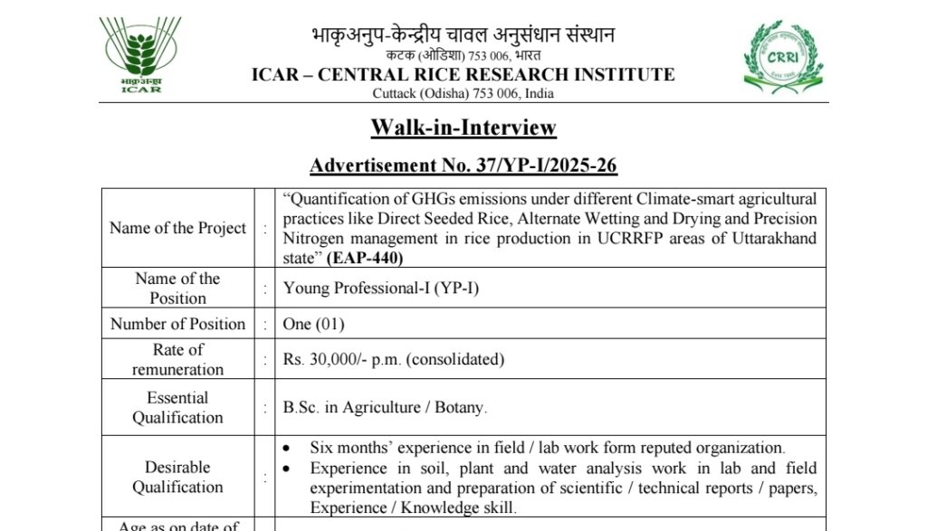 ICAR Central Rice Research Institute (ICAR-CRRI) has released the Young Professional-I Recruitment 2026 notification (Advt. No. 37/YP-I/2026-26) for eligible candidates from Odisha. The recruitment is for the post of Young Professional-I, and applicants must hold a B.Sc. degree in Agriculture. Selected candidates will receive a consolidated salary of ₹30,000 per month. The selection process will be through a Walk-in Interview, and no application fee has been mentioned in the notification. The job location will be Odisha. Interested and eligible candidates are advised to visit the official website https://icar-crri.in for complete details and interview schedule.