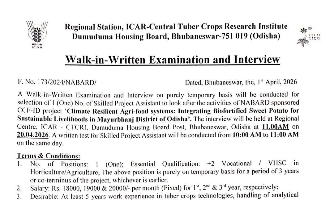 ICAR Central Tuber Crops Research Institute has announced recruitment for the post of Skilled Project Assistant under Advt No. F. No – 173/2024/NABARD/. There is 1 vacancy available, and candidates from Odisha are eligible to apply. Applicants must have +2 Vocational/VHSC in Horticulture or Agriculture. The maximum age limit is 45 years, with a monthly salary of Rs. 18,000 to Rs. 20,000. This is a contract-based position, and selection will be through a walk-in interview scheduled on 20 April 2026. Interested candidates can visit the official website http://ctcri.org/ for more details.