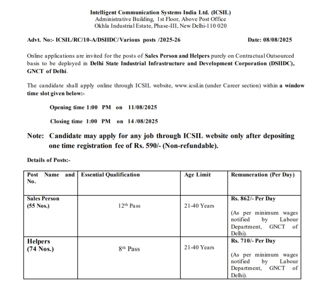 The Intelligent Communication Systems India Ltd. (ICSIL) has released notification Advt No. ICSIL/RC/10-A/DSIIDC/Various posts/2025-26 for recruitment to 129 vacancies for the posts of Sales Person and Helpers. Candidates from across India are eligible to apply. The selection process will be based on an interview and evaluation of relevant work experience. Interested and eligible applicants must submit their applications through the official ICSIL website before the closing date of 14 August 2025. Applicants should ensure they meet the required qualifications and possess the necessary experience for the respective post. This recruitment offers an excellent opportunity for individuals seeking stable employment in a reputed organization.
