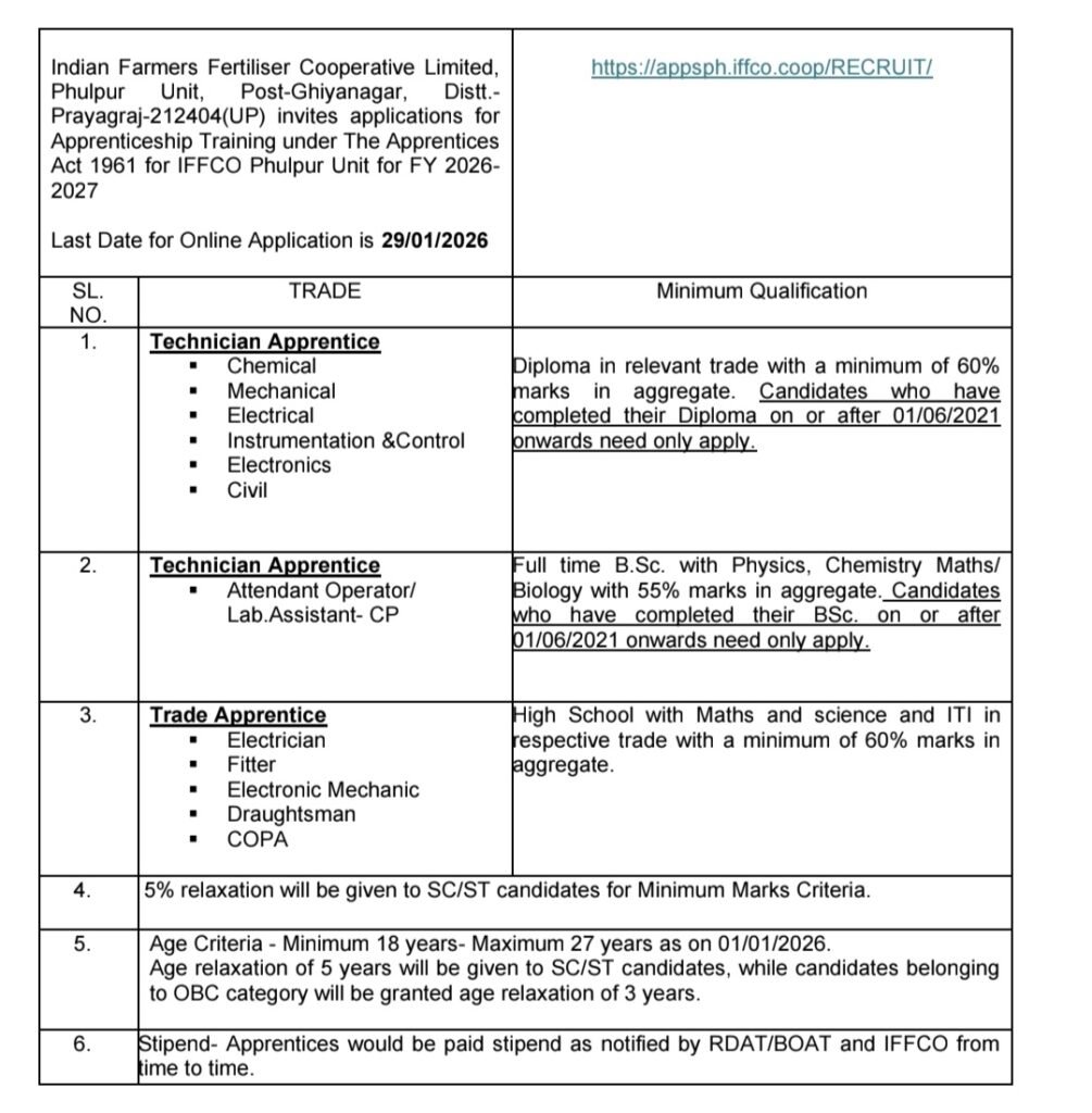 Indian Farmers Fertilizer Cooperative Limited (IFFCO) has invited applications for the recruitment of Trade Apprentice and Technician Apprentice posts. The number of vacancies has not been specified. Candidates who have completed ITI are eligible to apply. The stipend will be paid as per the norms prescribed by RDAT/BOAT. Applicants must be 18 to 27 years of age as on 01 January 2026. There is no application fee for this recruitment. The job location will be across India. Interested and eligible candidates can apply online on or before 29 January 2026.