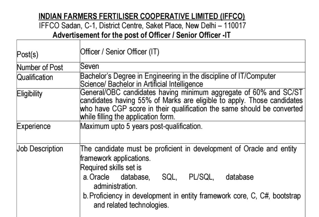 The Indian Farmers Fertiliser Cooperative (IFFCO) has announced the Recruitment 2026 for the post of Officer/Senior Officer (IT), offering a great opportunity for candidates across India. A total of 7 vacancies are available, and applicants must hold a Bachelor’s Degree to be eligible. The age limit for candidates is between 21 and 27 years. Selected candidates will receive a salary as per the IFFCO pay structure, along with other benefits. This is a full-time position, and interested candidates must apply online through the official website before the last date, 28 April 2026.