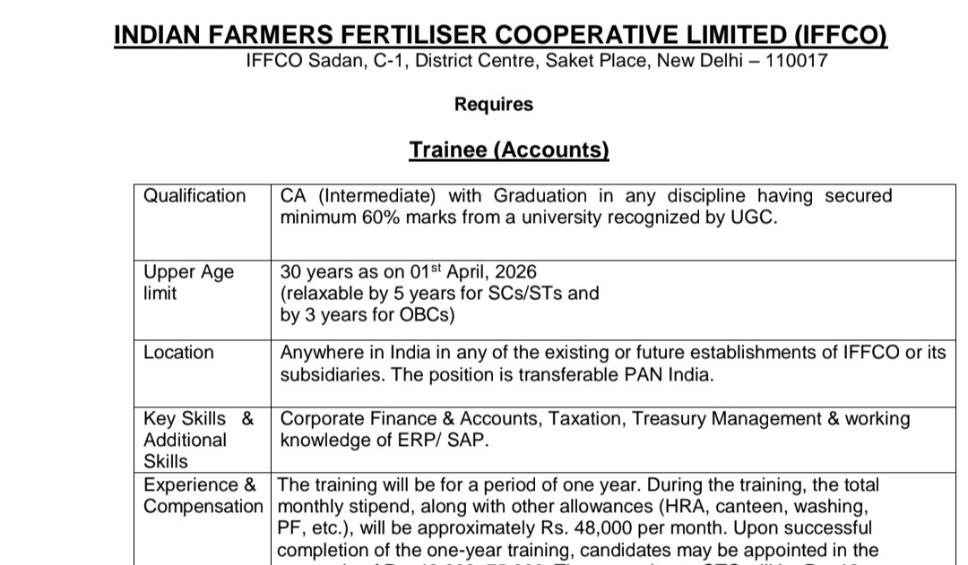 The Indian Farmers Fertiliser Cooperative Limited (IFFCO) has released a notification for the recruitment of Trainee (Accounts) posts for 2026. Candidates from across India who have completed their graduation are eligible to apply for this opportunity. The age limit for applicants is between 18 and 30 years, and the selection process will include an online test, followed by a personal interview and medical examination. The training period will be one year, after which selected candidates can expect a salary ranging from ₹40,000 to ₹75,000 per month, with an approximate annual CTC of ₹12 lakh. Interested candidates must apply online through the official website before the last date, 15 April 2026.