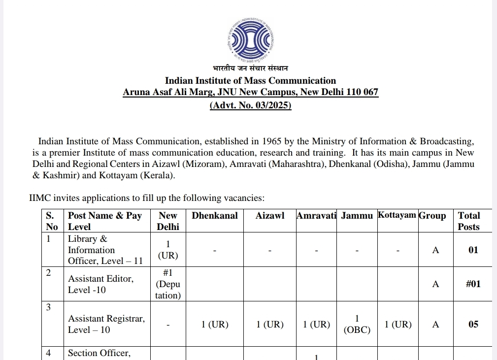 Indian Institute of Mass Communication (IIMC) has released the Non Teaching Recruitment 2026 notification to fill 51 Group A, B and C posts. Applications are invited from eligible candidates with Bachelor’s or Master’s degrees. The age limit ranges from 32 to 56 years, depending on the post. Selected candidates will receive salary as per 7th CPC Level 4 to 11. Selection includes written, skill tests and interviews. Job locations include New Delhi and regional campuses across India.