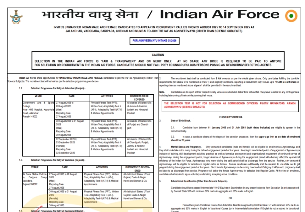 The Indian Air Force has released a notification for the Agniveervayu Recruitment 2025. This opportunity is open for candidates from Odisha who are interested in serving the nation by joining the Air Force. The recruitment is for the post of Agniveer Vayu, and eligible candidates can apply online through the official website. While the exact number of vacancies and application fee have not been mentioned, applicants are advised to carefully check the official notification for complete details including the selection process. The last date to apply is 14th September 2025. For further updates, visit mayurbhanj.odisha.gov.in.