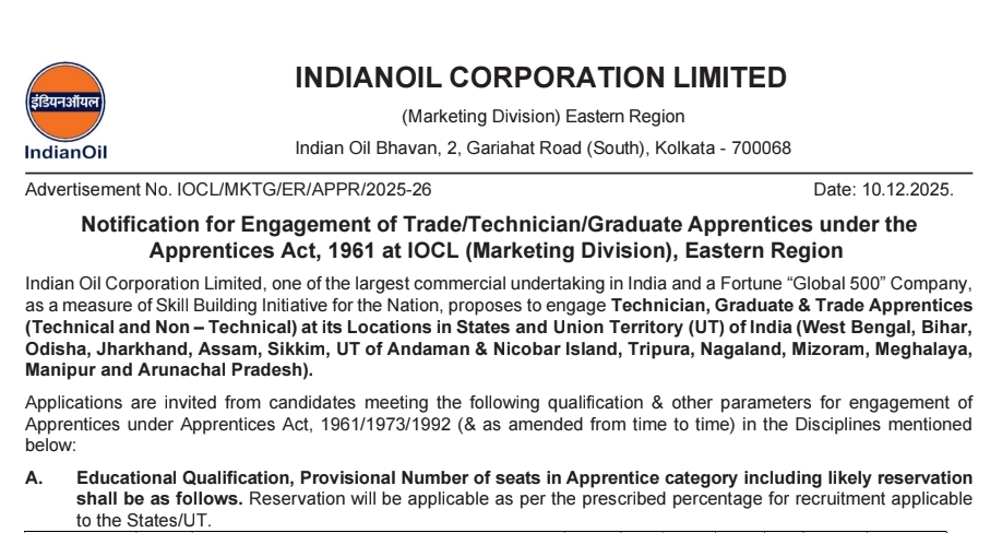Indian Oil Corporation Limited (IOCL) has announced a recruitment drive for the year 2026, inviting online applications for 509 vacancies across various apprenticeship positions, including Technician Apprentice, Trade Apprentice, Graduate Apprentice, and Data Entry Operator (DEO). Eligible candidates with qualifications such as ITI, Diploma, Graduation, or Class 12th, depending on the discipline, can apply for these posts. The age criteria for applicants is 18 to 24 years, and the stipend will be provided as per the Apprentices Act 1961/1973/1992/2019/2025. The official notification was released on 10 December 2025, and the online application process commenced on the same day from 10:00 AM onwards. Interested and eligible candidates can submit their applications on or before 09 January 2026 through the official website www.iocl.com/apprenticeships to secure an opportunity to train with one of India’s leading public sector enterprises.