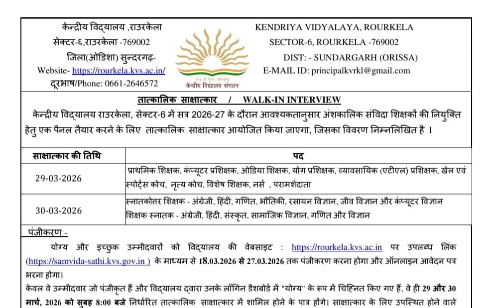 The Kendriya Vidyalaya Rourkela has announced Recruitment 2026 for Part-Time Contractual Teachers, offering a great opportunity for candidates in Odisha. Applicants with qualifications such as B.Tech/B.E, MCA, or any graduate degree are eligible to apply. The salary ranges between ₹21,250 and ₹27,500 per month, and the maximum age limit is 65 years. The selection process includes online application submission, a walk-in interview, and panel preparation. Interested candidates can apply online through the official website from 27th March 2026 to 30th March 2026. This is a contractual job opportunity, making it ideal for experienced professionals and fresh graduates looking to gain teaching experience in a reputed institution.