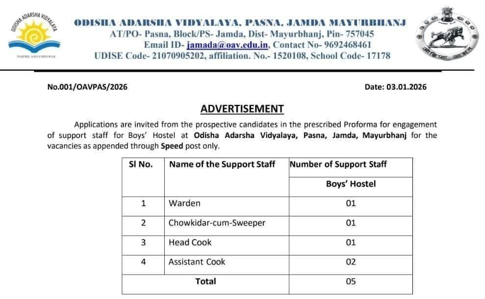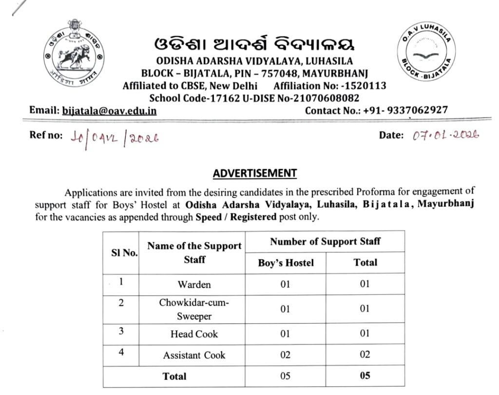 Odisha Adarsha Vidyalaya Luhasila, Bijatala, Mayurbhanj has invited offline applications from eligible candidates of Odisha for the recruitment of 05 posts for Warden, Chowkidar-cum-Sweeper, Head Cook, and Assistant Cook (Boys’ Hostel). Candidates having qualifications ranging from HSC to Graduation are eligible to apply. The selected candidates will receive a monthly salary between ₹6,750 and ₹21,175 (including EPF share). The selection will be based on an interview. Interested and eligible candidates must submit their offline application on or before 23 January 2026. For detailed notification and application procedure, candidates are advised to visit the official website mayurbhanj.odisha.gov.in.