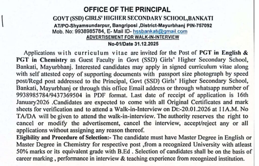 Govt (SSD) Girls’ Higher Secondary School, Bankati, has released a notification for the recruitment of PGT in English and PGT in Chemistry on a Guest Faculty basis for the year 2025. Eligible candidates must possess a Master’s degree in the concerned subject with at least 50% marks along with a B.Ed. qualification. Selected candidates will be paid Rs. 400 per class/lecture, with a maximum of 40 classes per month. Interested and eligible applicants should apply on or before 16 January 2026. For detailed information and official updates, candidates are advised to visit the official website mayurbhanj.odisha.gov.in.