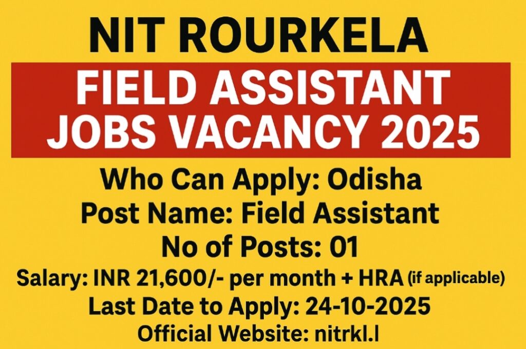 National Institute of Technology (NIT) Rourkela has announced a job vacancy for the post of Field Assistant. There is one position available for candidates belonging to Odisha. The selected candidate will receive a monthly salary of INR 21,600/- plus HRA (if applicable). Applicants must possess an ITI qualification to be eligible for this role. The last date to apply is 24th October 2025. Interested candidates can visit the official website https://nitrkl.ac.in/ for detailed information and application procedures.