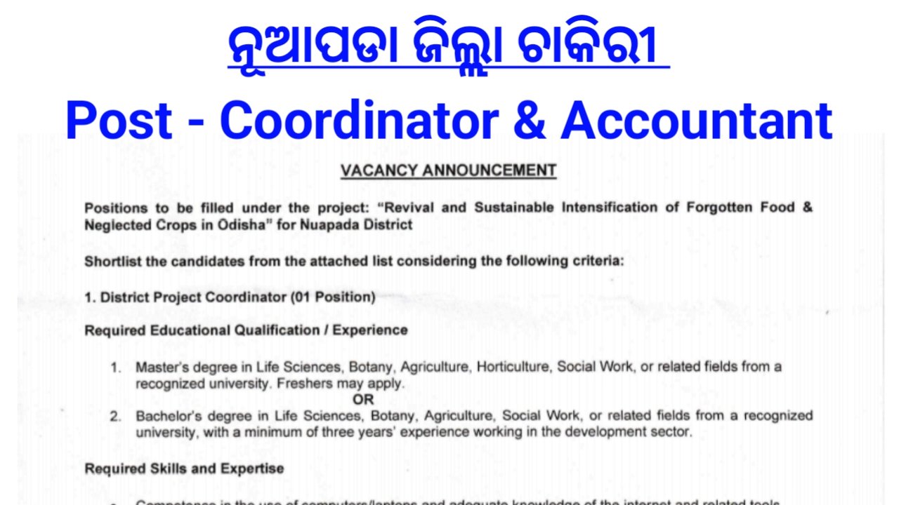 The Nuapada District Government of Odisha has released a recruitment notification for 2026, inviting applications for the posts of District Project Coordinator and District Accountant. A total of 2 vacancies are available on a contract basis, and candidates holding a Master’s degree are eligible to apply. The application process is offline via email, and interested applicants must submit their applications before the last date, 15 April 2026. This is a good opportunity for candidates seeking government jobs in Odisha, especially those looking for short-term contractual roles in district-level administration. Applicants are advised to check the official website for detailed eligibility criteria, age limit, and application instructions before applying.