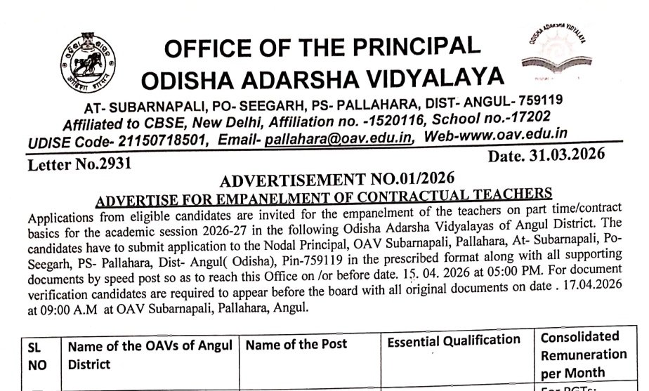 Odisha Adarsha Vidyalaya, Angul District has announced a recruitment notification (Advt No. 01/2026) for the post of Contractual Teacher. Candidates who have completed Post Graduation are eligible to apply, and applicants must be between 18 to 65 years of age. This opportunity is open to candidates belonging to Odisha. The recruitment will be conducted through an offline application process, followed by a walk-in interview scheduled on 17 April 2026. Interested candidates must ensure they submit their applications before the last date, 15 April 2026. This is a contract-based teaching position offering a valuable opportunity in the education sector under Odisha Adarsha Vidyalaya, Angul.