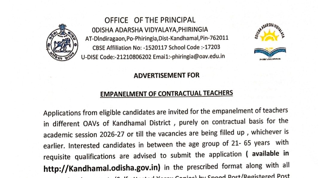 The Odisha Adarsha Vidyalaya, Kandhamal District has announced OAV Kandhamal District Recruitment 2026 for Contractual Teacher posts. Candidates from Odisha who have completed Graduate or Post Graduate with B.Ed. are eligible to apply. The salary offered ranges from ₹20,000 to ₹30,000 per month. The selection process will be based on an interview. Applicants must be between 21 and 65 years of age. The last date to apply is 21 March 2026, and the walk-in interview will be held on 26 March 2026. Interested candidates must apply offline and attend the interview with required documents. For more details, visit the official website.