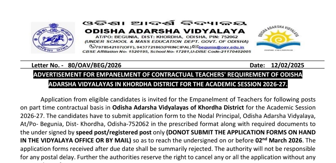 OAV PGT & TGT Teachers Recruitment 2026: Odisha Adarsha Vidyalayas (OAV) has released a recruitment notification for the appointment of Post Graduate Teachers (PGT) and Trained Graduate Teachers (TGT) on a contractual basis. As per Letter No. 80/OAV/BEG/2026 dated 12 February 2025, eligible candidates from Odisha can apply for these teaching positions through offline mode. The salary offered ranges from ₹20,000 to ₹25,000 per month, depending on the post. Applicants must be between 18 and 65 years of age. The last date to submit the application form is 02 March 2026. Interested candidates are advised to visit the official website https://khordha.odisha.gov.in for detailed eligibility criteria, application format, and further instructions.