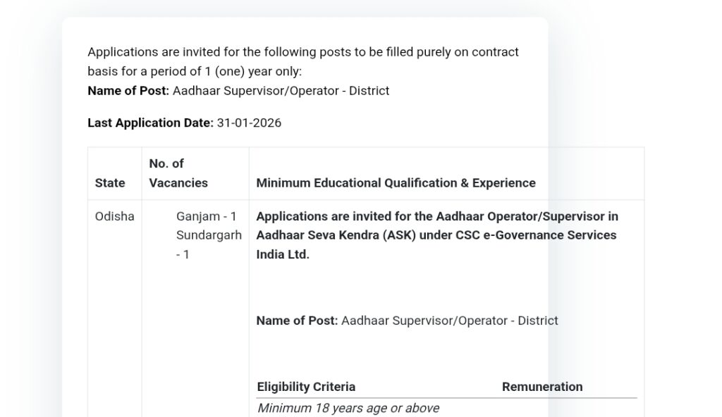 Aadhaar Supervisor/Operator Recruitment 2026 Notification has been released by CSC e-Governance Services India for eligible candidates from Odisha. Applications are invited for the posts of Supervisor/Operator with approximately 282 vacancies. Candidates who have completed 10th, 12th, or ITI are eligible to apply. The minimum age limit is 18 years, and selected candidates will receive a salary as per the minimum wages fixed by the respective state for semi-skilled manpower. Interested and eligible applicants can apply online on or before 31 January 2026 through the official website https://cscspv.in.
