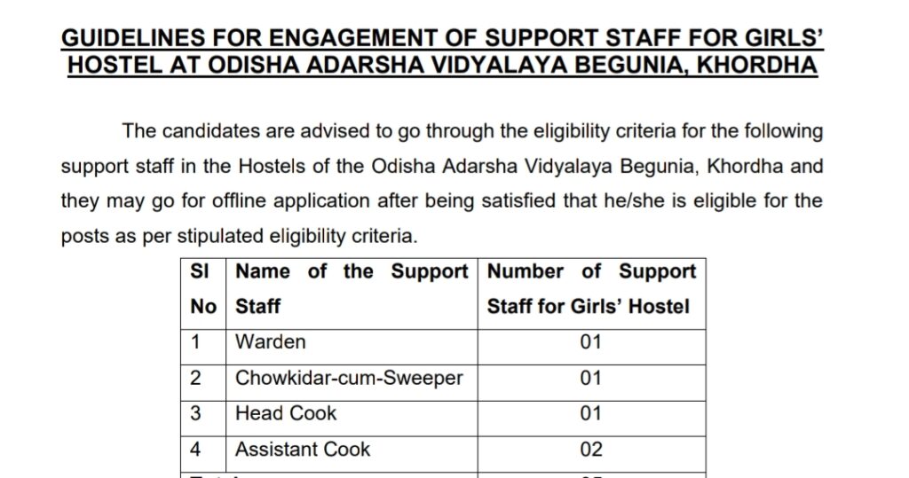 Odisha Adarsha Vidyalaya (OAV) has released a notification for the recruitment of staff posts in 2025. A total of 05 vacancies are available for eligible candidates across Odisha. Both male and female candidates can apply for these positions. The recruitment offers a monthly salary ranging from ₹10,000/- above, depending on the post and qualifications. Interested applicants must fulfill the eligibility criteria set by OAV to be considered for the selection process. This is a great opportunity for aspirants seeking government sector jobs in Odisha. The application fee details have not been mentioned.