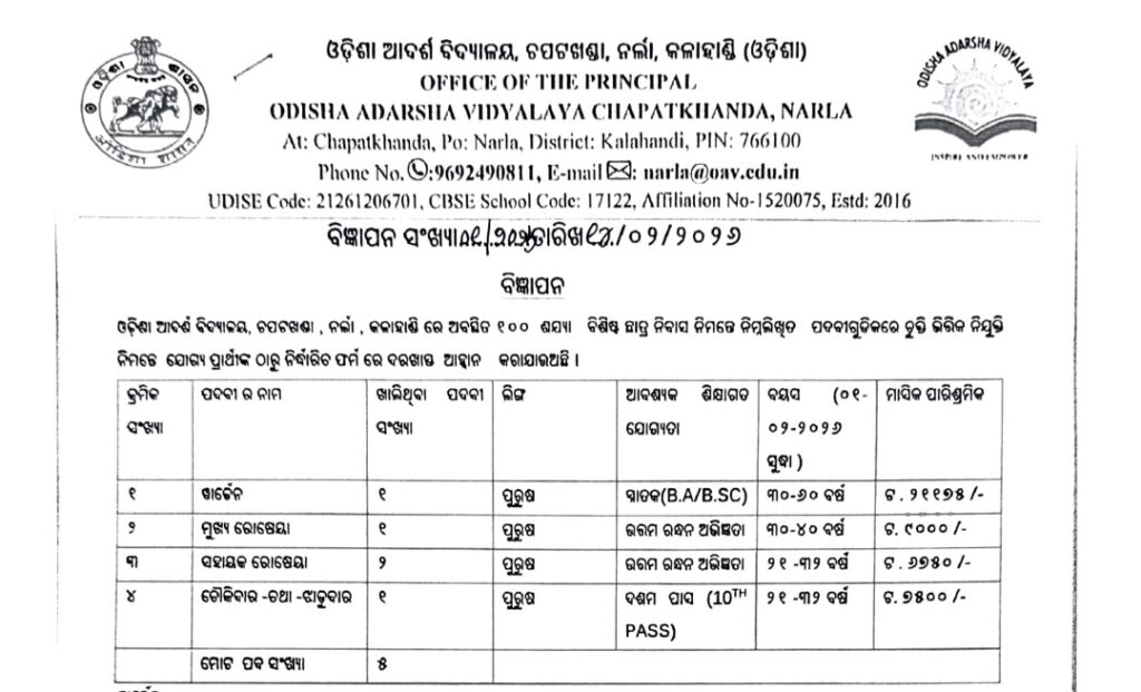 | Organization Recruitment | Odisha Adarsha Vidyalaya, Chapatkhanda, Narla |