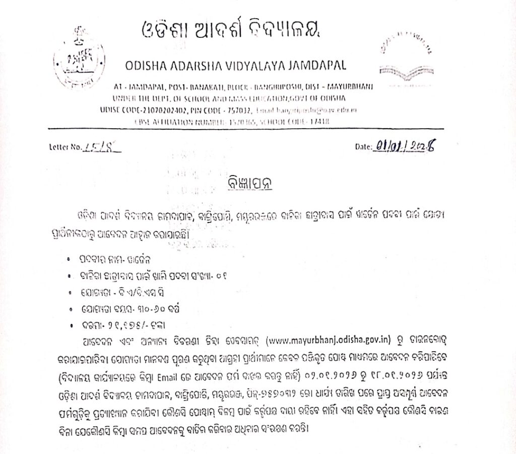 Odisha Adarsha Vidyalaya, Jamdapal, Bangriposi invites offline applications from eligible female candidates for engagement of one (01) Warden for the Girls’ Hostel. The candidate must be a graduate (B.A/B.Sc from a recognized university), aged between 30–60 years, with at least 2 years of experience in hostel management, and willing to stay in the hostel 24×7. The consolidated remuneration is ₹21,175/- per month including EPF share of employee and employer. Preference will be given to local candidates of the block, failing which candidates from adjacent blocks of the district may be considered. In-service teachers of OAV willing to discharge warden duties in addition to their regular work may be paid an additional ₹3,000/- per month, subject to staying in the hostel and taking full responsibility.