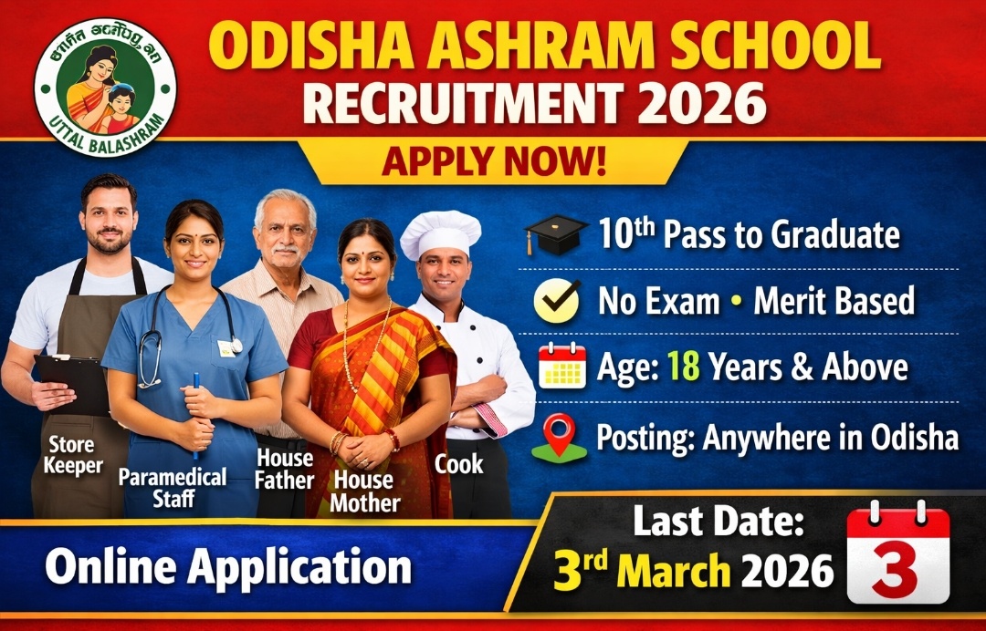 Utkal Balashram has released the Odisha Ashram School Recruitment 2026 notification to fill various contractual posts. Eligible candidates from across Odisha can apply online for positions including Store Keeper cum Accountant, Paramedical Staff, House Father, House Mother, Cook, and Helper cum Night Watchman. Applicants must have educational qualifications ranging from 10th pass to Graduate, with a minimum age limit of 18 years. The selection process will be based on merit and document verification, and there will be no written examination. Selected candidates will be posted anywhere in Odisha. Interested and eligible candidates must submit their online application on or before 3rd March 2026.