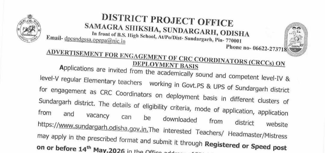 Samagra Shiksha Sundargarh has announced Odisha District Coordinator Recruitment 2026 for CRC Coordinator posts. Eligible Level IV and V regular elementary teachers from Odisha can apply through offline mode. Both male and female candidates are eligible. Applications must be sent via Speed or Registered Post before 14 May 2026. For detailed notification and updates, visit the official website Sundargarh District Administration.