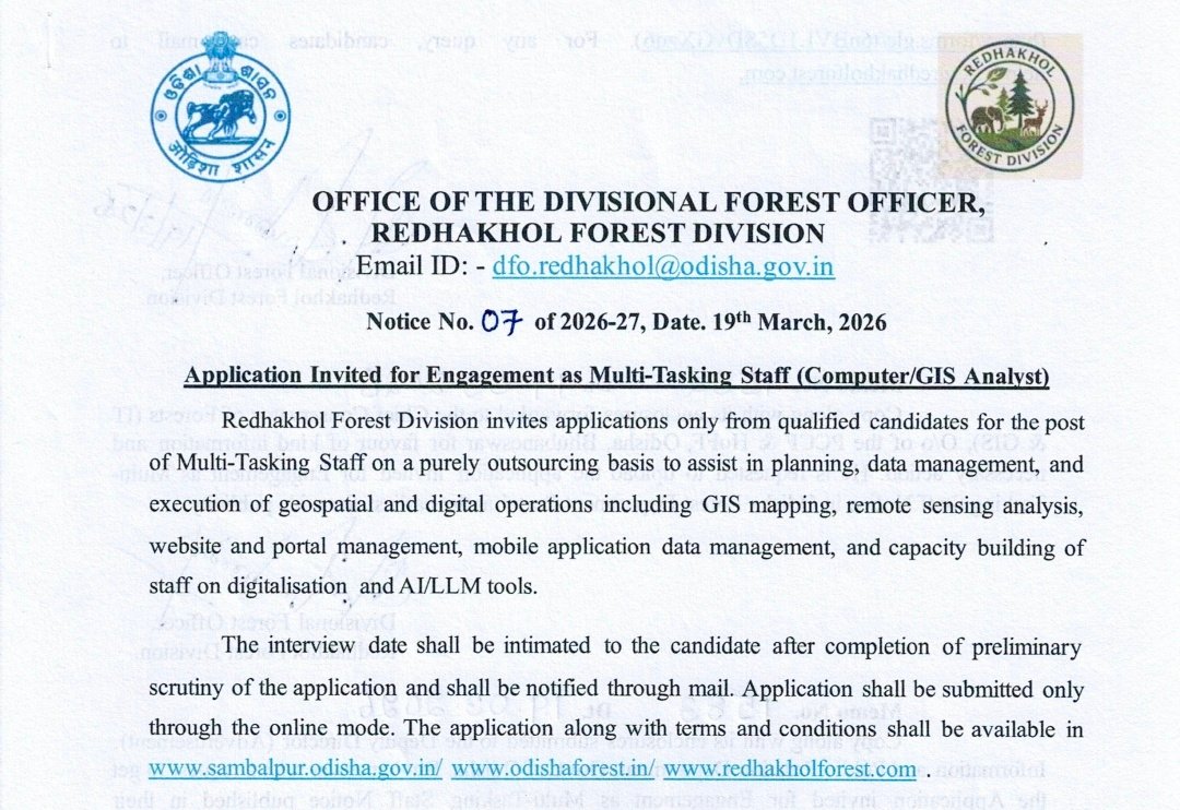 The Redhakhol Forest Division has released a recruitment notification (Advt No. 07 of 2026-27) for the post of Multi-Tasking Staff (Computer/GIS Analyst) on a contract basis. Candidates from Odisha who hold a B.Tech or B.E in Computer Science are eligible to apply. The upper age limit is 35 years. The selected candidates will receive a monthly salary of ₹36,000. The application process is online, and interested applicants must submit their forms before the last date, 10 April 2026, through the official website.