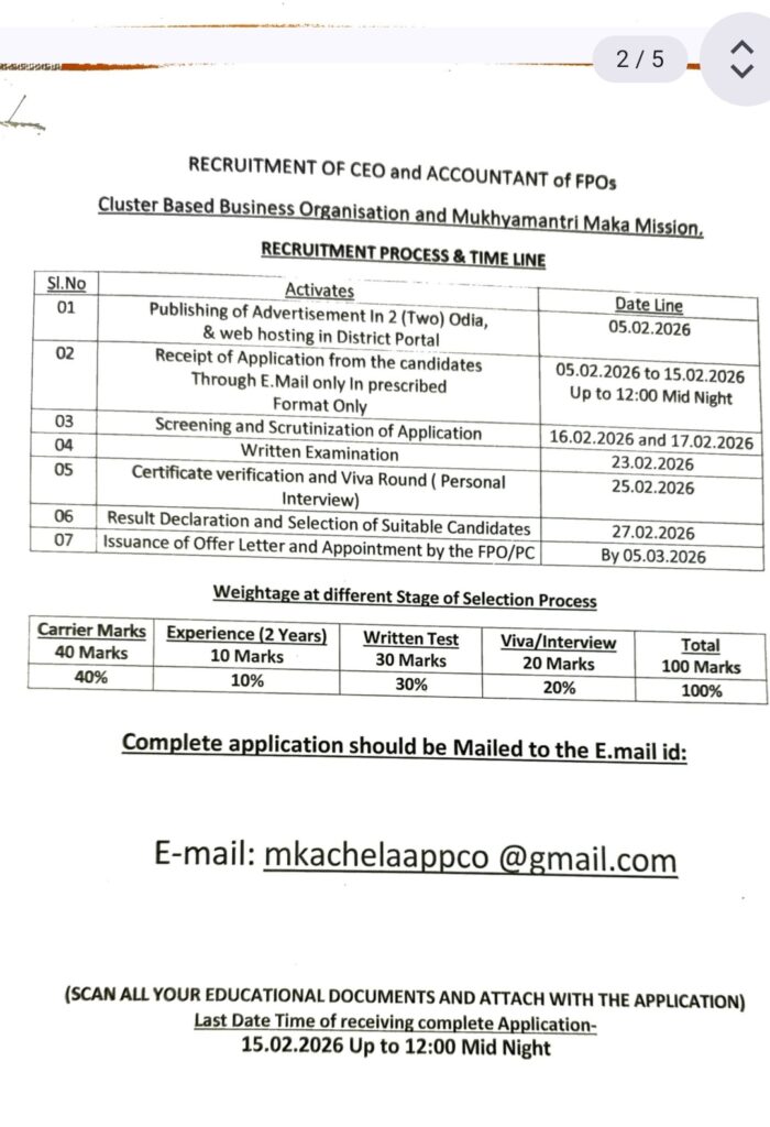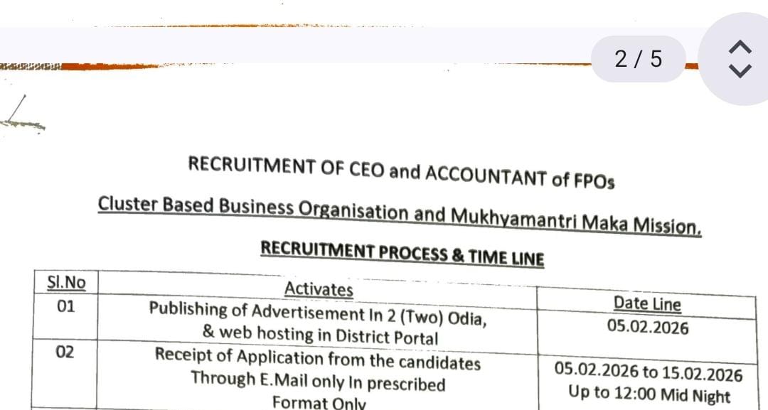 Applications are invited by Kachela Agro Products Producers’ Company Limited, Koraput, for recruitment to the posts of CEO and Accountant. A total of more than ten vacancies are available. Eligible candidates from all districts of Odisha can apply through offline mode by sending their duly filled application form via Speed Registered Post. The place of posting will be within Odisha. Interested applicants must ensure that their application reaches the given address on or before 15 February 2026. For further details and clarification, candidates should follow the official notification.