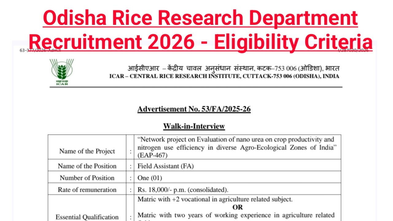 Odisha Rice Research Department Recruitment 2026 – Eligibility Criteria & Details