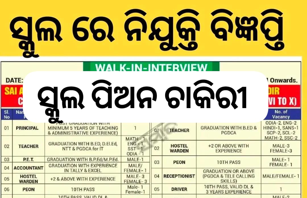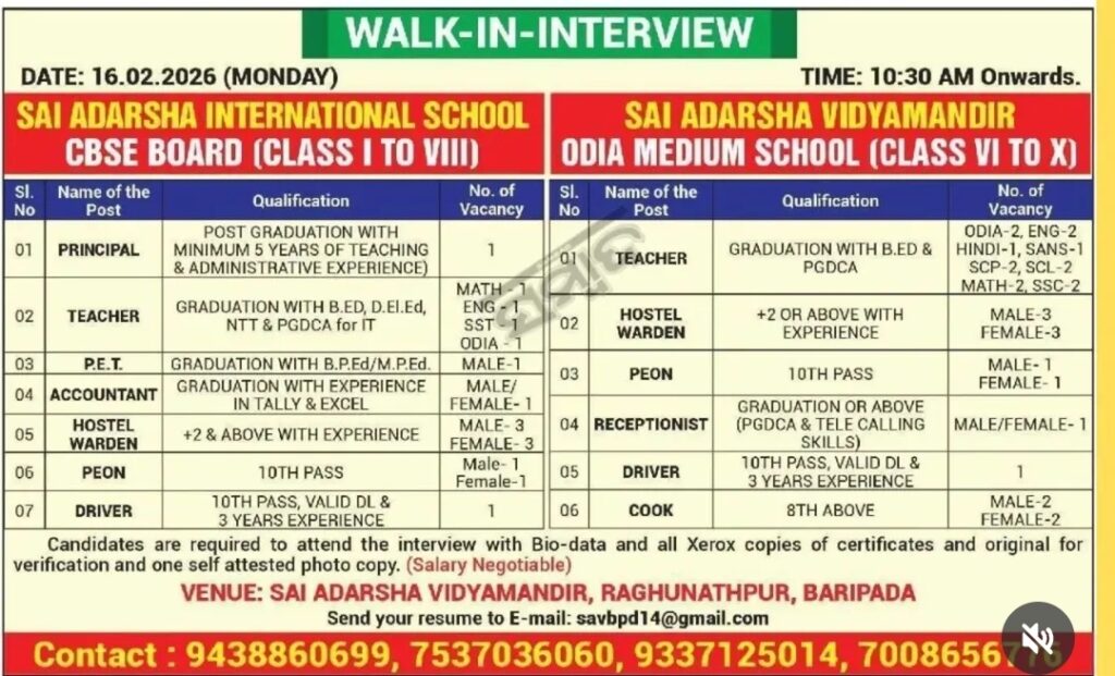 Sai Adarsha International School (CBSE Board, Class I to VIII) and Sai Adarsha Vidyamandir (Odia Medium School, Class VI to X) are conducting a walk-in interview on 16.02.2026 (Monday) from 10:30 AM onwards at Sai Adarsha Vidyamandir, Raghunathpur, Baripada for the posts of Principal, Teachers (Math, English, SST, Odia, Hindi, Sanskrit, Science, Social Science, IT), P.E.T, Accountant, Hostel Warden, Receptionist, Peon, Driver and Cook. Required qualifications include Post Graduation with experience for Principal, Graduation with B.Ed/D.El.Ed/NTT/PGDCA for Teachers, B.P.Ed/M.P.Ed for P.E.T, Graduation with Tally & Excel for Accountant, +2 or above for Hostel Warden, 10th pass for Peon and Driver (with valid DL & 3 years experience), and 8th pass or above for Cook. Interested candidates should bring their bio-data, xerox copies of all certificates, original certificates for verification, and one self-attested photo copy. Salary is negotiable. Resumes may also be sent to savbpd14@gmail.com.