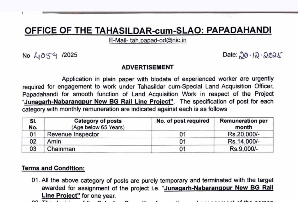 The Office of the Tahasildar-cum-SLAO, Papadahandi (Nabarangpur District) has released a notification for the recruitment of Revenue Inspector (R.I), Amin, and Chainman posts for 2026. A total of 3 vacancies are available under this recruitment drive. The selected candidates will receive a monthly remuneration of ₹20,000 for Revenue Inspector, ₹14,000 for Amin, and ₹9,000 for Chainman. Applicants must be experienced workers and should possess the required educational qualifications along with valid identity proof. The age limit is below 65 years as on the date of application. The application process will commence on 20 December 2025 and conclude on 30 December 2025. Interested and eligible candidates are advised to apply within the stipulated time through the official website nabarangpur.odisha.gov.in.