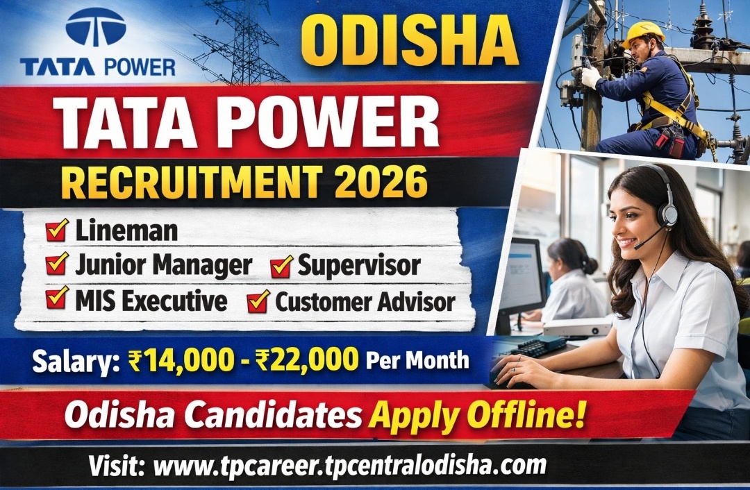 TATA Power Limited has released a fresh recruitment notification for Odisha TATA Power Recruitment 2026, inviting offline applications from eligible male and female candidates across Odisha. This recruitment drive aims to fill various permanent posts in the Electric Department, including Lineman, Junior Manager, Supervisor, MIS Executive, Customer Engineer (Billing), and Customer Advisor. Selected candidates will be posted within Odisha and will receive an attractive monthly salary ranging from Rs. 14,000 to Rs. 22,000. All eligible Odisha candidates can apply through offline mode, while the last date to apply will be announced soon. Interested applicants are advised to regularly visit the official website https://tpcareer.tpcentralodisha.com for detailed eligibility criteria, application procedure, and further updates regarding the recruitment process.