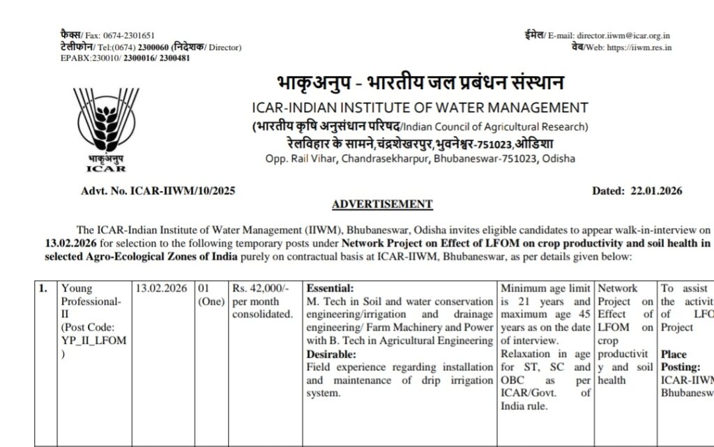 Odisha Water Department Recruitment 2026 has been announced by ICAR–Indian Institute of Water Management (IIWM) for the recruitment of Young Professional-II, Young Professional-I, Senior Research Fellow, and Senior Skilled Labour posts on a contractual basis. Candidates who have passed 10th or 12th, or possess Post Graduate / M.Tech / M.E qualifications are eligible to apply as per post requirements. All eligible candidates from Odisha can participate in this recruitment. The selection will be done through Walk-in-Interview, and the salary ranges from ₹15,000 to ₹42,000 per month. The place of posting will be Odisha. Interested and eligible candidates must attend the walk-in-interview on 11 February 2026 and 13 February 2026 as per the official schedule. For detailed eligibility criteria, interview dates, and other instructions, candidates should visit the official website of ICAR IIWM.
