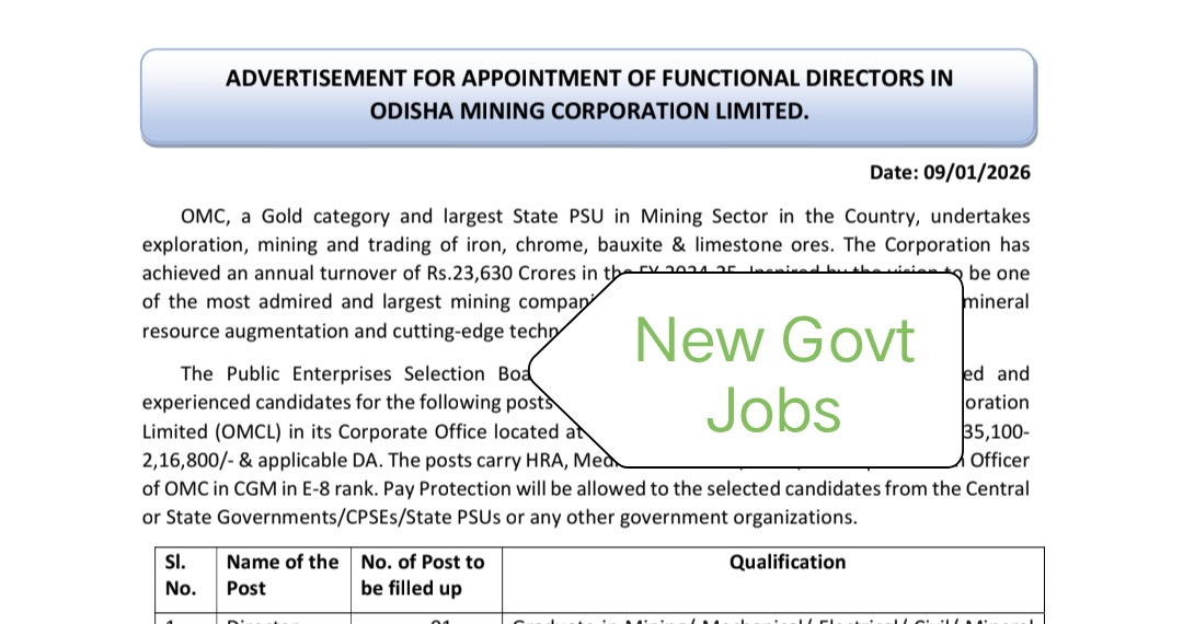Odisha Mining Corporation Limited (OMC) has released the OMC Recruitment 2026 notification inviting applications from eligible candidates of Odisha for the posts of Director (Project & Planning) and Director (Exploration). A total of 02 vacancies are available, and selection will be based on an interview. Candidates should be graduates in any discipline and fall within the age limit of 50 to 57 years. The selected candidates will receive an attractive salary ranging from ₹1,35,100 to ₹2,16,800 per month. Interested and eligible applicants must apply through offline mode on or before 28 January 2026. For detailed information and application format, candidates are advised to visit the official website https://omcltd.in.